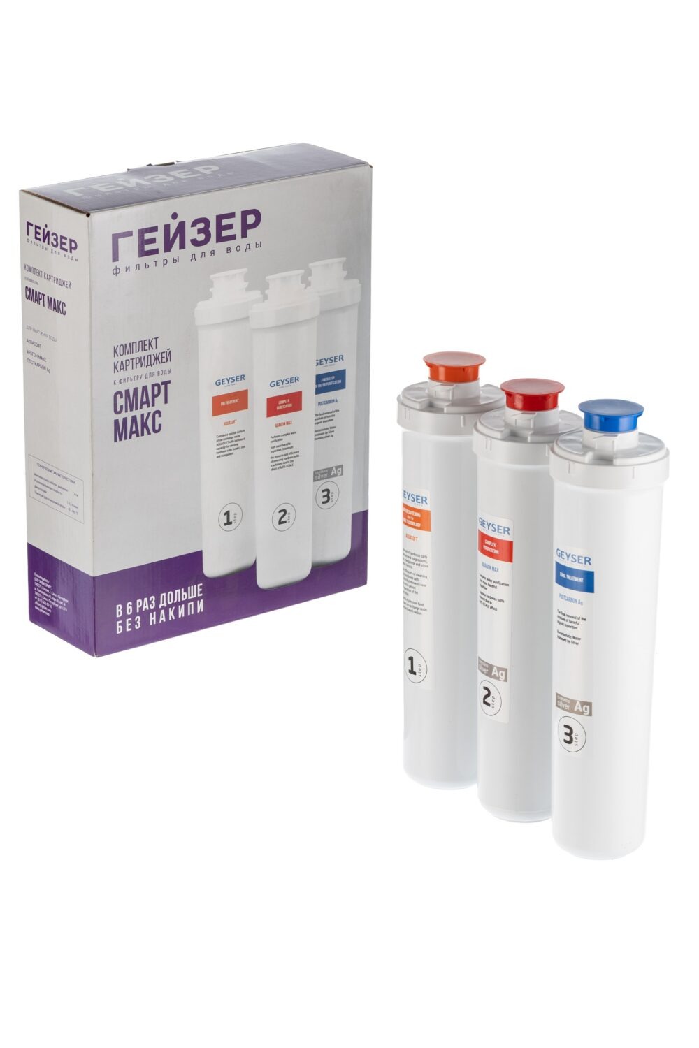 - Посткарбон Ag Смарт (третья ступень) — картридж из прессованного кокосового активированного угля (карбон-блок). Эффективно удаляет органические и хлорорганические соединения, свободный хлор, неприятные запахи, улучшает все органолептические показатели воды. Внедрение серебра в картридж обеспечивает бактериостатический эффект в течение всего срока службы.